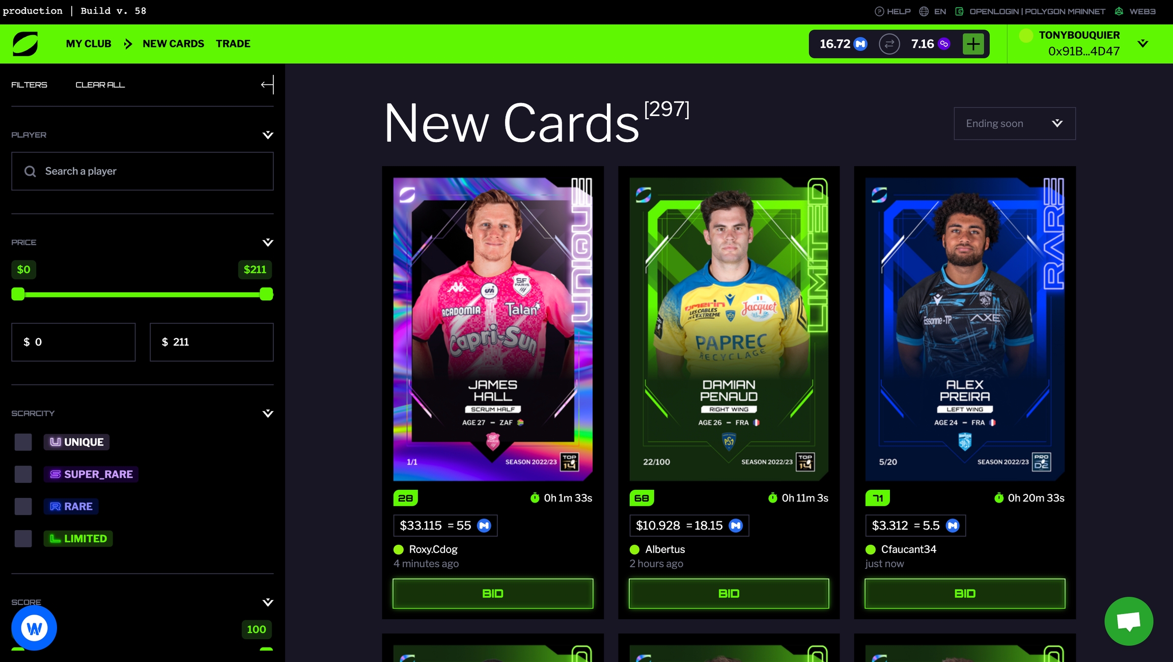 Ce marché sert de point central de l'excitation, offrant des opportunités exclusives pour acquérir des cartes fraîchement frappées. Grâce à des mécanismes soigneusement conçus, tels que des sorties contrôlées (cartes de joueur et de ressource) et des boosters aléatoires (pour les cartes de booster), les joueurs ont une chance d'obtenir des cartes très recherchées, souvent accompagnées d'attributs uniques tels que les compétences des joueurs et leurs performances.
