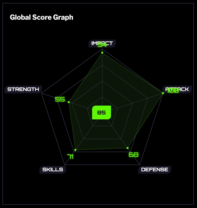 Les scores des joueurs dans OVAL3 sont calculés à l'aide d'un système complet qui prend en compte cinq attributs clés : Force, Compétences, Impact, Défense et Attaque.